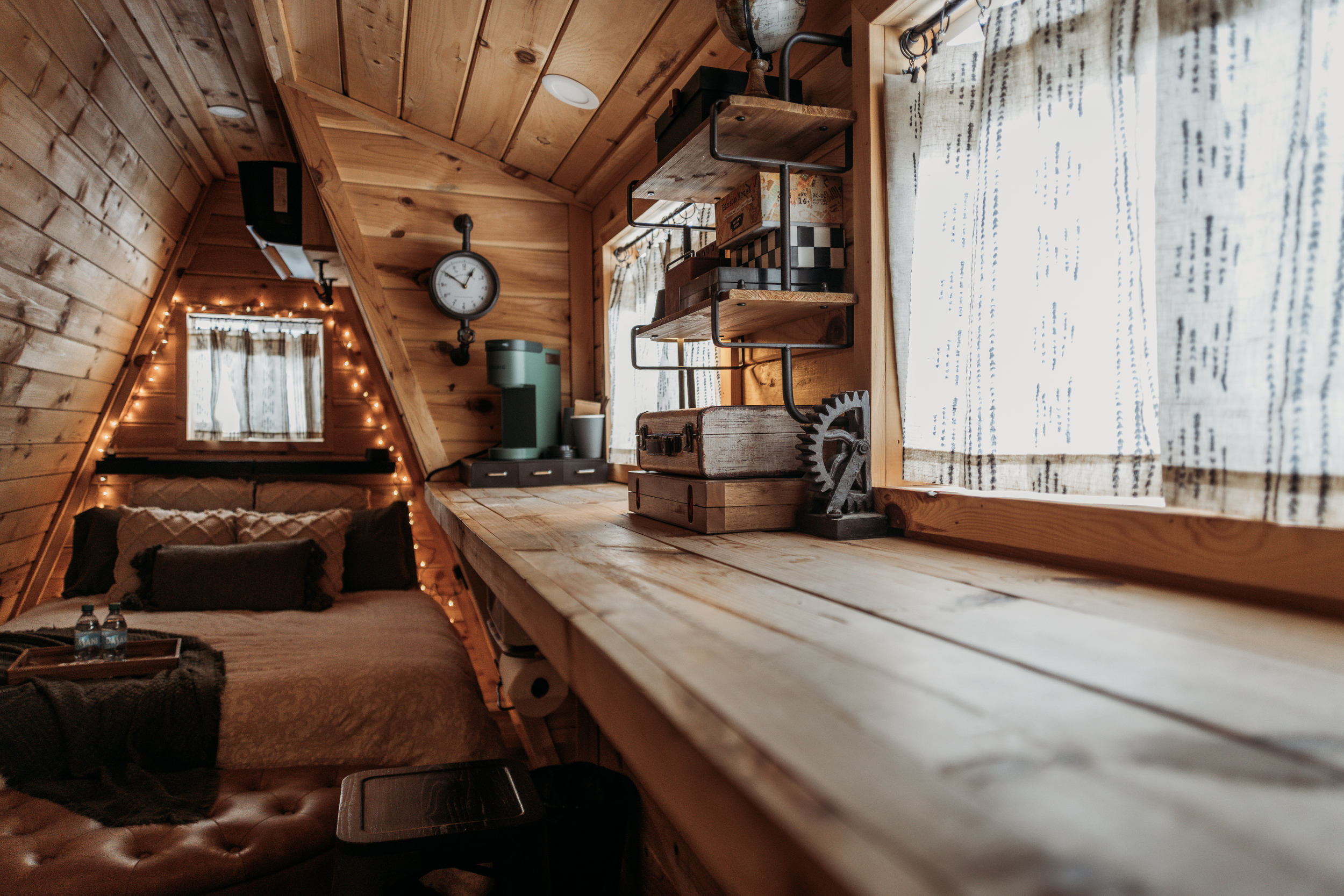If you’d rather just enjoy the escape from every-day life, the micro A-frame is 240 square feet of temperature controlled comfort. The cozy queen sized bed is the perfect place to nap or snuggle, watch a movie, read a book, chat with your other half, or just lay and think about whatever your mind desires; you’ll have everything you need to make your glamping escape as comfortable as can be. Equipped with a Keurig and countertop electric burners, air fryer/toaster oven, smart tv, mini fridge, microwave, mini split and grid powered electric for anyone who’d rather just stay inside and soak up this beautiful interior space, too.